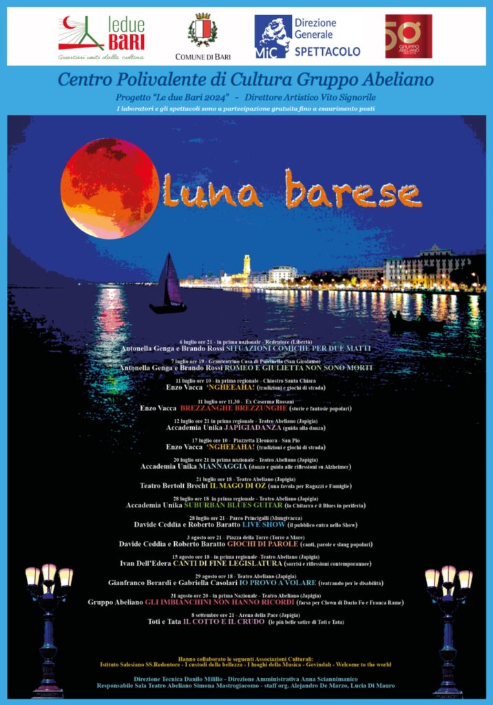 TOTI E TATA con VITO SIGNORILE, con ANTONELLA GENGA e BRANDO ROSSI, con DAVIDE CEDDIA e ROBERTO BARATTO, con GIANFRANCO BERARDI e GABRIELLA CASOLARI, con ENZO VACCA, con TEATRO BERTOLT BRECHT, con ACCADEMIA UNIKA, con IVAN DELL’EDERA, con NICOLA CONVERSANO, ANTONELLA LISO, AGATA PARADISO, EDOARDO EPIFANI, DANIELA LADISI, TOMMASO CITARELLA, LUCIA PETRONI, MATILDE MILETO, con DANILO MILILLO, ANNA SCIANNIMANICO, SIMONA MASTRO, ANTONELLA CARRONE, ALEJANDRO DE MARZO, LUCIA DI MAURO, gli artisti e i tecnici impegnati nel progetto Luna Barese. Leggi